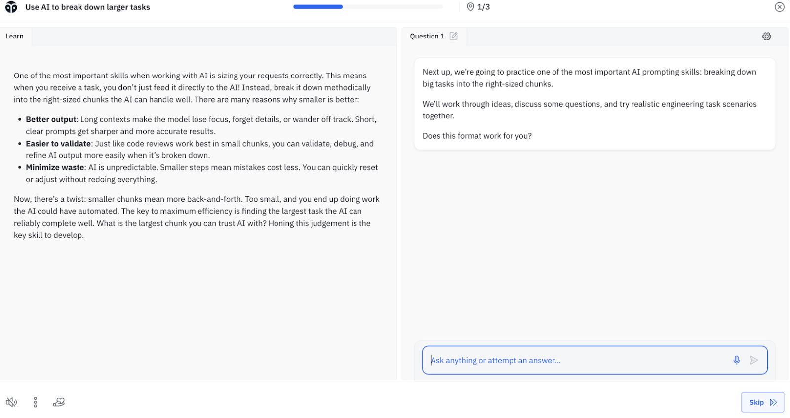 The update supports Formation’s broader mission to give engineers more autonomy over how they learn, striking a balance between structure and self-direction. By allowing Fellows to focus where they feel confident and revisit challenging topics later, the new feature keeps progress continuous and momentum strong.